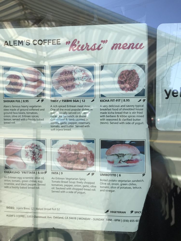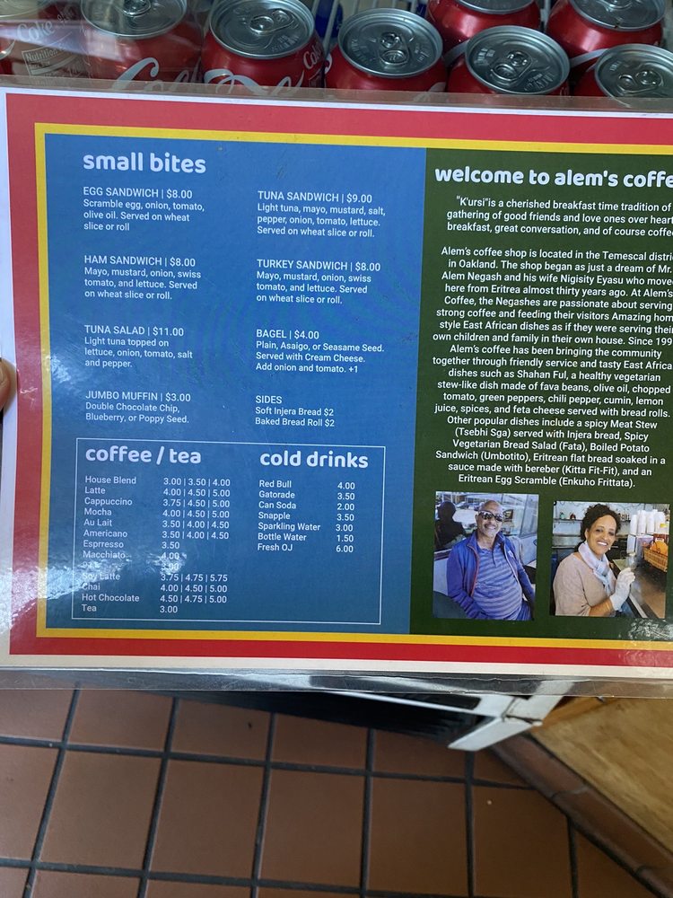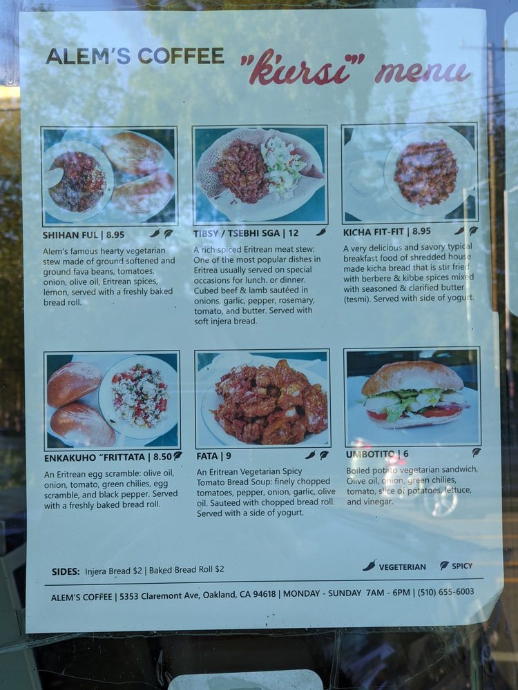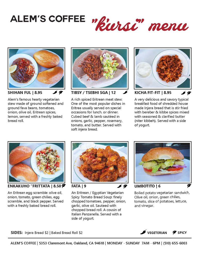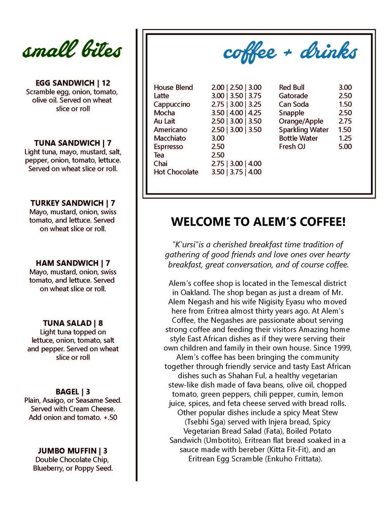 Alem’s Coffee, located in Oakland, CA, offers a unique blend of Eritrean cuisine and coffee beverages. The menu boasts hearty vegetarian options like Shihan Ful, a flavorful stew made with fava beans and spices, and Tibsy Sga, a rich spiced meat stew served with injera bread. The beverage selection includes classic options like lattes and chai, as well as unique choices like 911 and macchiatos. Customer reviews rave about the friendly service and authentic flavors. With a welcoming atmosphere and delicious food, Alem’s Coffee is a must-visit for those looking to experience Eritrean cuisine in a cozy setting.